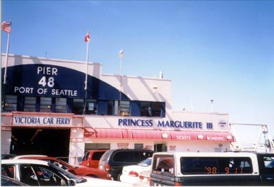 インターネットであらかじめ予約しておくことをお勧めします。 シアトルから乗る場合はPIER48(48番埠頭)に出発の30分前くらい前までに行きます。シアトル・タコマ空港からの場合は I-405(E)からI−5(North)に入り途中で99号線に入ります。(ジャンクションが複雑なので注意)99号線に入ったら左側に見える埠頭の番号を注意して48番を見落とさないこと。埠頭の入り口に係員のおじさんがいてパスポートのチェックを受けたあと車を誘導。所定の位置についたら、チケットオフィスでチケットを購入します。出港10分くらい前から船内に車を移動します。
